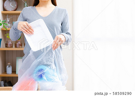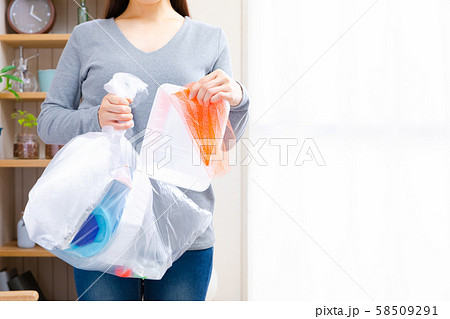 キッチンでゴミを分別して捨てる女性 ごみ リサイクル イメージ
