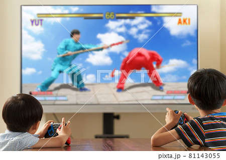 テレビゲームを楽しむ2人の男の子の後ろ姿