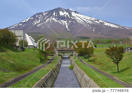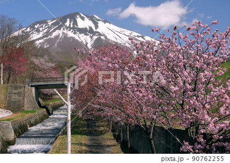 青森県弘前市百沢裾野 オオヤマザクラネックレスロードに面する岩木山総合公園の桜並木と冠雪した岩木山