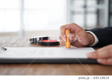 書類に法人印鑑を押す日本人男性ビジネスマン