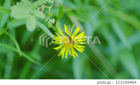 Coltsfoot blooms in spring showcasing vibrant yellow flowers among green grass with blurred background