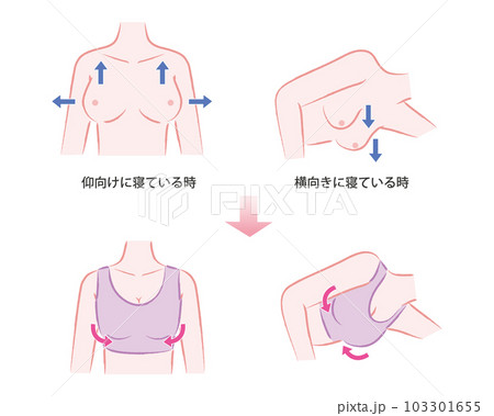 ナイトブラ・補正下着を正しく着用してバストアップするイラスト ビフォーアフター
