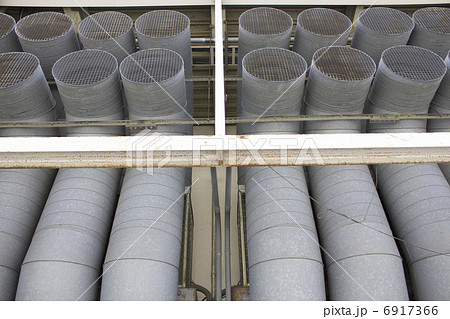 Air ventilator system in large commercial building, Air flow ventilate fan machine with smoke filter duct outside roof building.