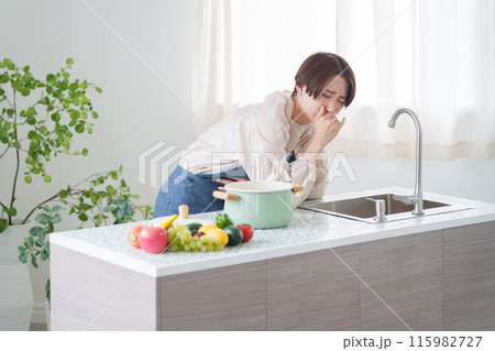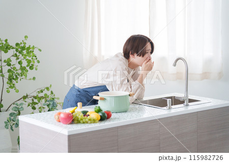 料理をしてつわりで吐く女性(キッチン・主婦)