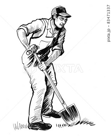 畑を耕す男性。 農作業、土を起こす。スコップで土を掘る。 農業と人物。イラスト素材