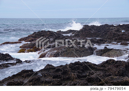 岩場にあたった波が白い波しぶきを創り出す