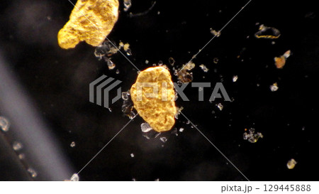 砂金採り 採れた砂金を虫メガネでクローズアップ