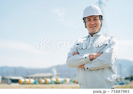 ヘルメットを被った作業着姿の腕組みするアジア人男性作業員