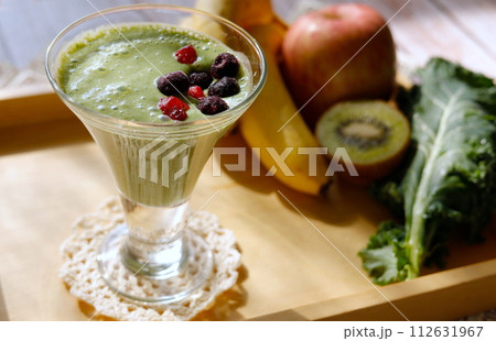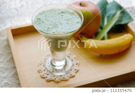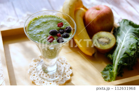 健康のための習慣:ケール、小松菜、リンゴ、バナナ、豆乳などが入ったグリーンスムージーの朝食