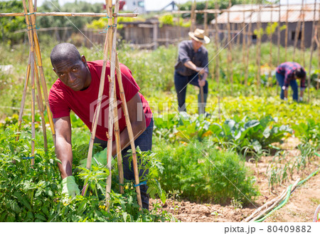 African american man with bamboo stick working with seedlings tomatoes