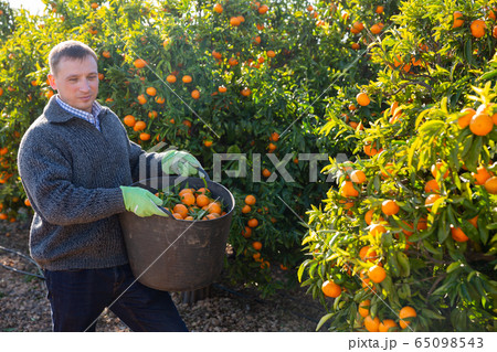 Farmer picking ripe mandarins