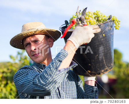 Winegrower carrying bucket with ripe grapes in vineyard
