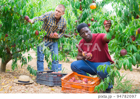 Men harvesting peaches