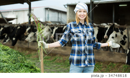 Female farmer collecting grass with pitchfork