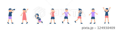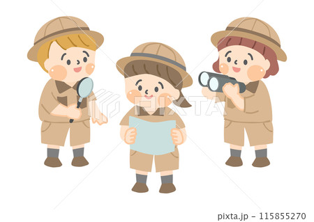 虫眼鏡と双眼鏡と地図を持った探検隊の子ども達