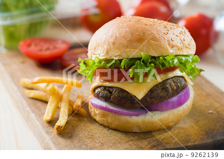 hamburger fast food with plenty of raw materials on the backgrou