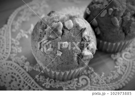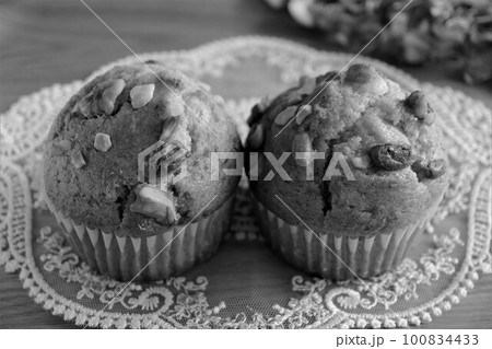 手作りのマフィン モノクロ おしゃれに盛り付けた洋菓子
