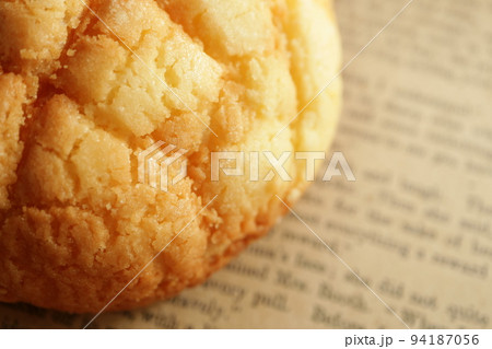 こんがり焼けたカリカリのメロンパン 背景英文紙