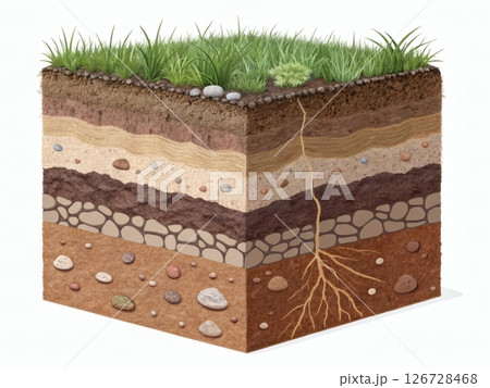Soil profile illustration with roots, stone layers and tunnel on clean white background