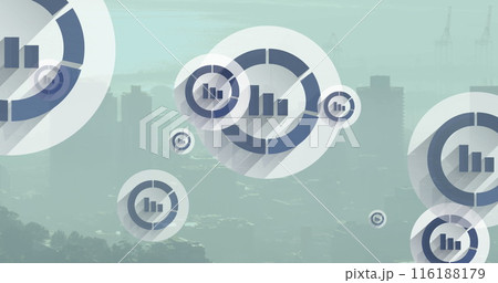 Image of multiple bar graph icons floating against aerial view of cityscape