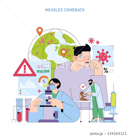 Measles outbreak illustration showing symptoms, a global map with affected regions, and vaccination efforts. Health professionals engaged in research and immunization highlighted.