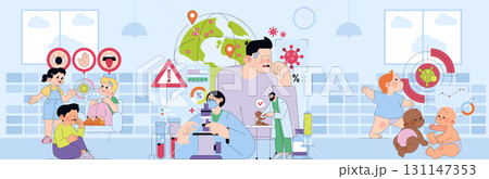Vector illustration depicting virus transmission and prevention. Children display symptoms, healthcare professionals work on research, and infants interact in a monitored environment.