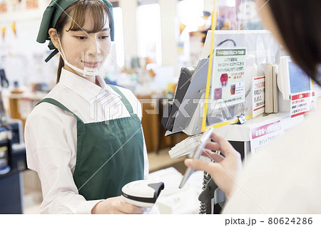 感染対策をしたスーパーのレジでスマホをスキャンする女性従業員 非接触イメージ