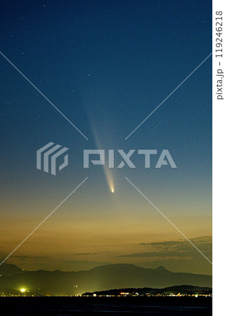 紫金山・アトラス彗星が夜明け前に湘南の海に昇る