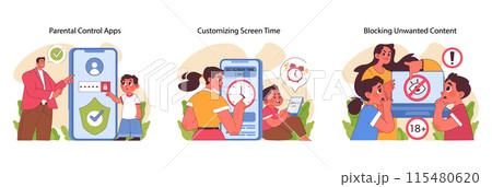 Parental control apps set. Secure child-device interaction, screen time management, and safeguarding against explicit content. Responsible modern digital parenting. Flat vector illustration