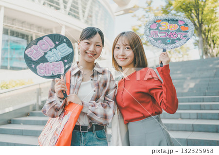 コンサートで熱狂的に盛り上がる女性ファン達 ペンライト うちわ