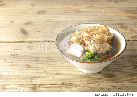 カマボコ、小ねぎの乗った熱々のかき揚げ蕎麦または天ぷら蕎麦を俯瞰で撮影