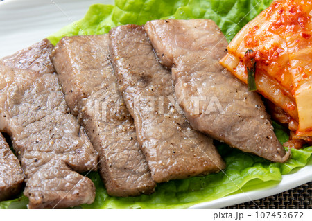 サンチュの上に牛カルビ焼肉とキムチ。