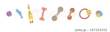 Dog chew toys. Rubber chicken, balls, fish bone skeleton, chew toys. Animals accessories, pet supplies. Vector illustration.