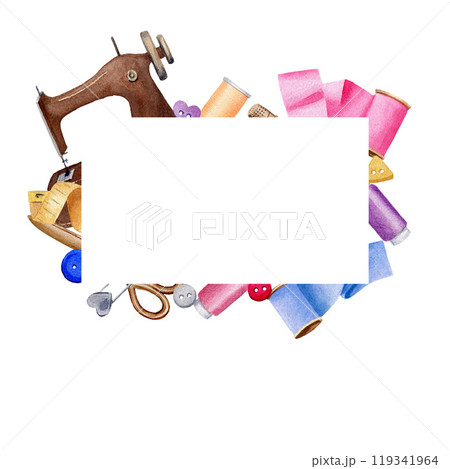 Sewing card with square copy space. Geometric square frame with sewing items. Watercolor illustration on white isolated background for design, print.