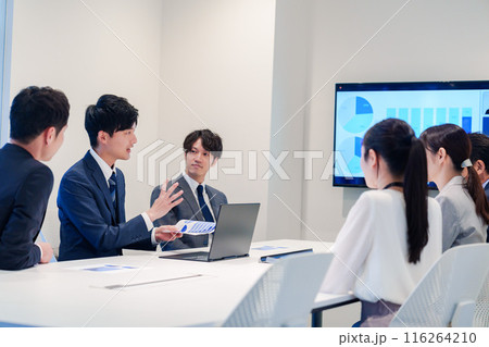 スーツを着て会議で話す若い男性
