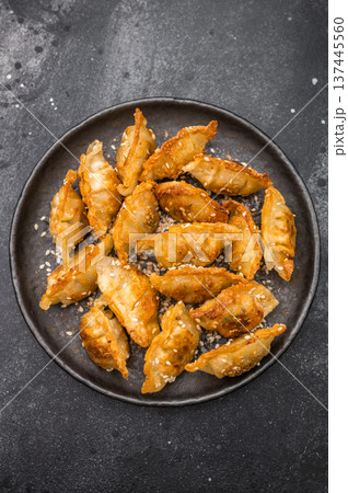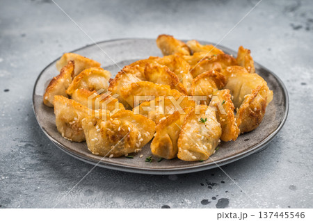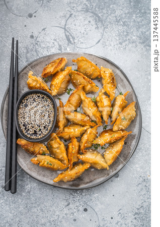 Golden fried dumplings gyoza with sesame seeds on gray tableware. Crunchy Asian potstickers shot top view on gray surface.