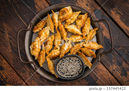 Crispy pan fried jiaozi dumplings with sesame served on dark plate. Asian mandu potstickers photographed top view on light background.
