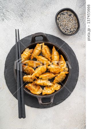 Golden pan fried dumplings jiaozi with sesame seeds, top view on light backdrop. Asian snack for restaurant design.