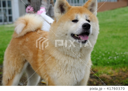新緑背景に柴犬 換毛期の柴犬 柴犬茜 シニアモデル犬