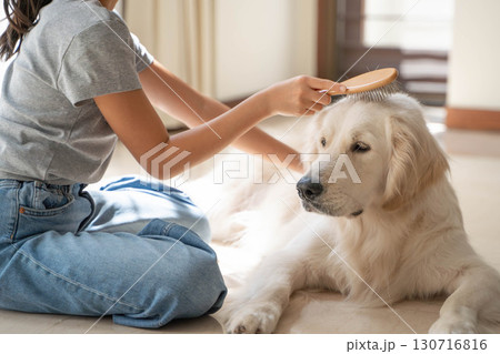 飼い主に優しくブラッシングしてもらうゴールデンレトリーバー