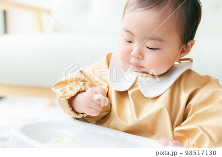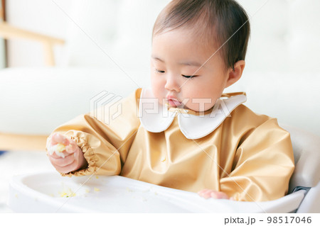離乳食を手づかみ食べするカミカミ期の赤ちゃん 握り潰す