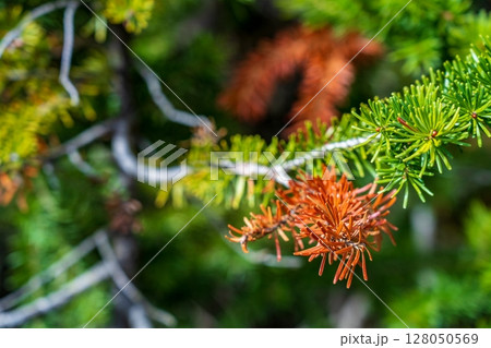 病害で鮮やかなオレンジ色に変わる亜高山帯モミの針葉の接写。カナダ、アルバータ州、バンフ