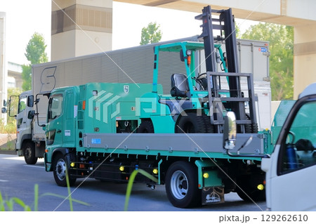 フォークリフトを搬送中のトラック イメージ