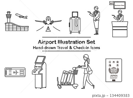 イラスト素材: 空港と旅行のチェックインを表す線画イラストセット
