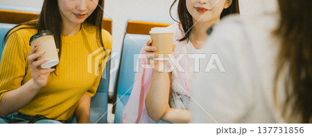 空港で休憩する友人たち ■撮影協力:関西国際空港(KIX)
