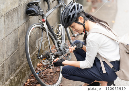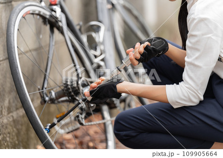 ロードバイクに 携帯用ポンプで空気を入れている若い女性
