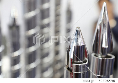 Close up scene the head of barrel screw of injection machine spare parts in the light blue scene.