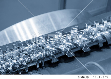 Close up scene body of the barrel screw of injection machine spare parts in the blue tone scene.