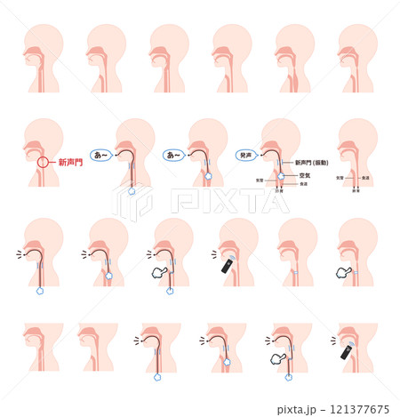 喉頭癌の手術後の発声方法のイラスト_通常の発声_食道発声_電気喉頭_シャント発声