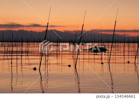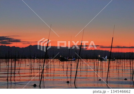 夕焼けに染まる有明海の海苔養殖場での作業風景